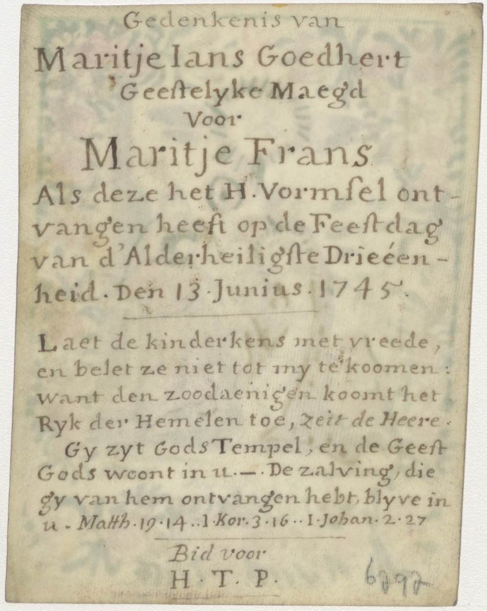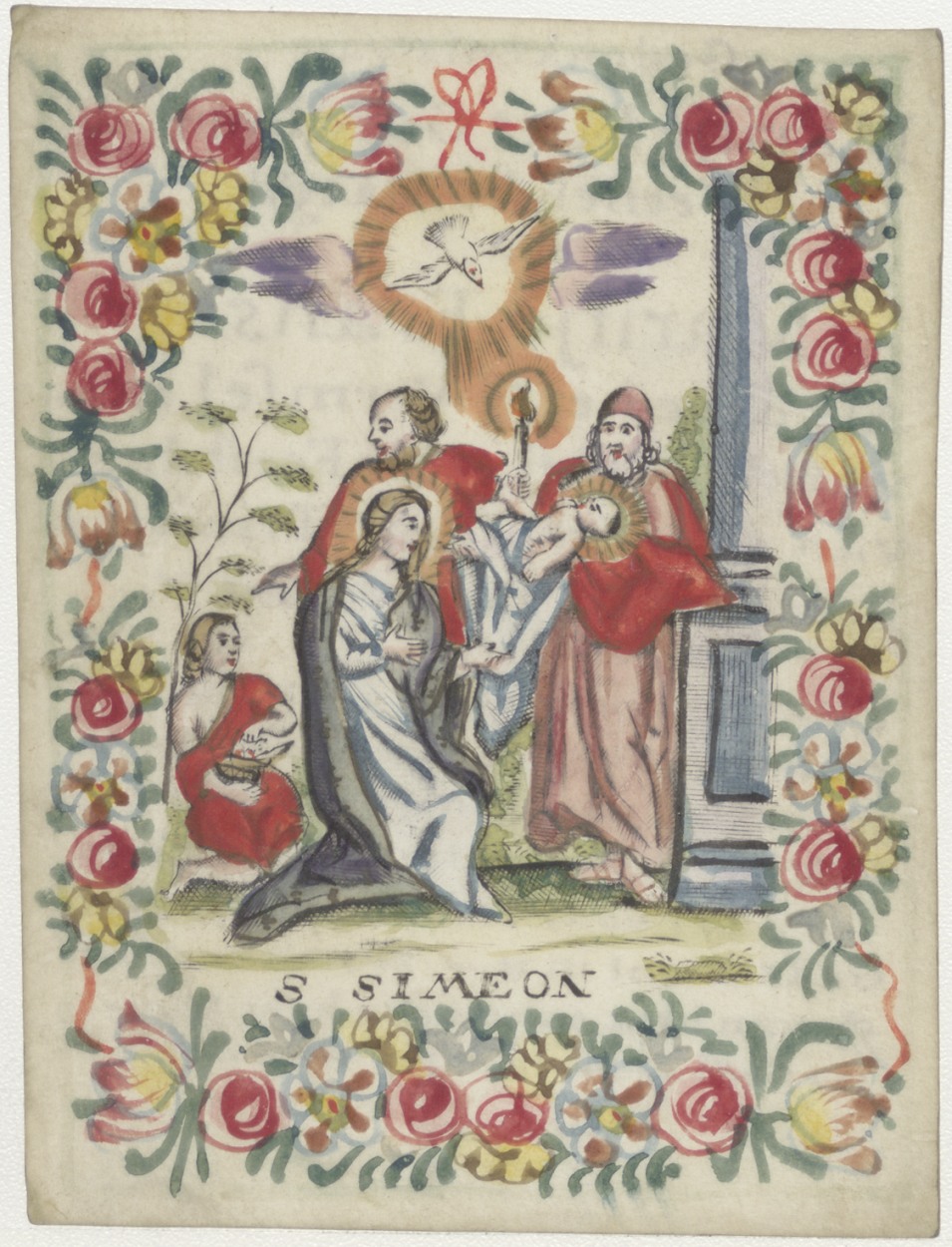 H. Simeon, ingekleurd, kz. H. Vormsel Maritje Frans (1745) van Maritje Jans Goedhert, geestelijk maagd, bid voor H.T.P.