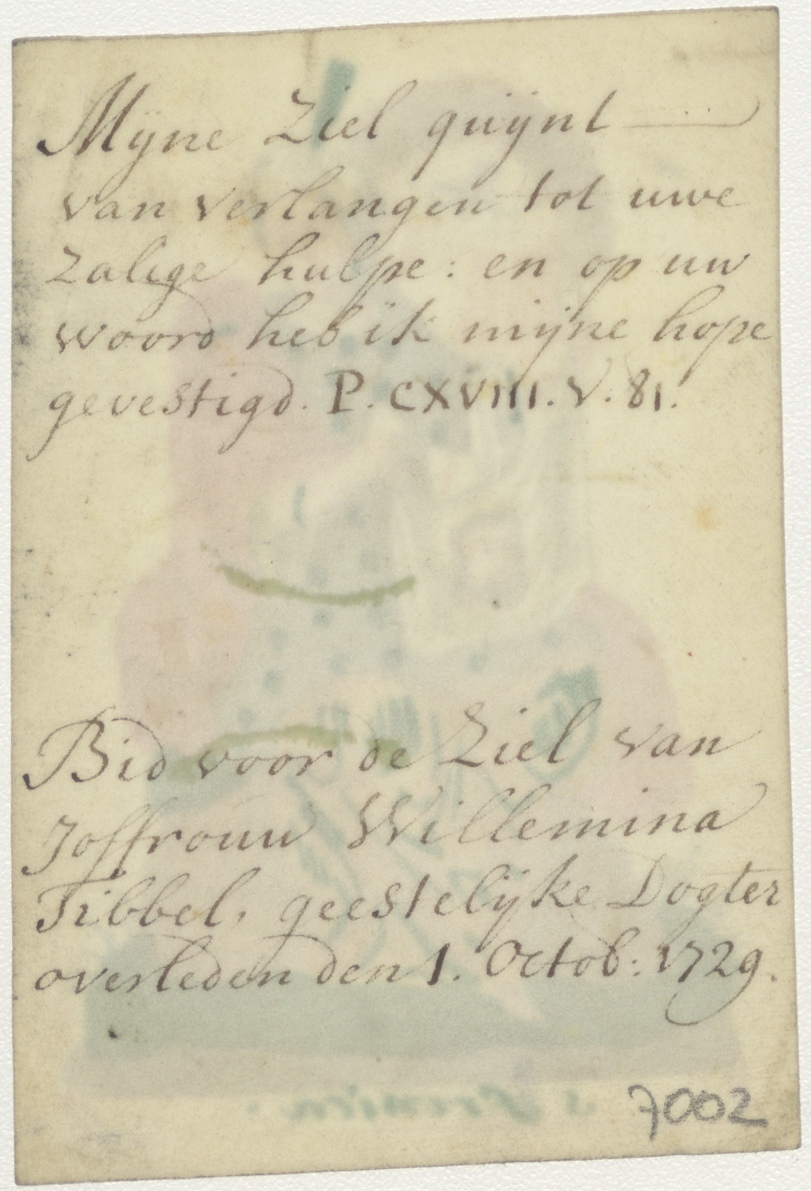 H. Veronika, ingekleurd, kz. Religieus; bid voor ziel Wilhelmina Tibbel (+1729) geestelijk dochter