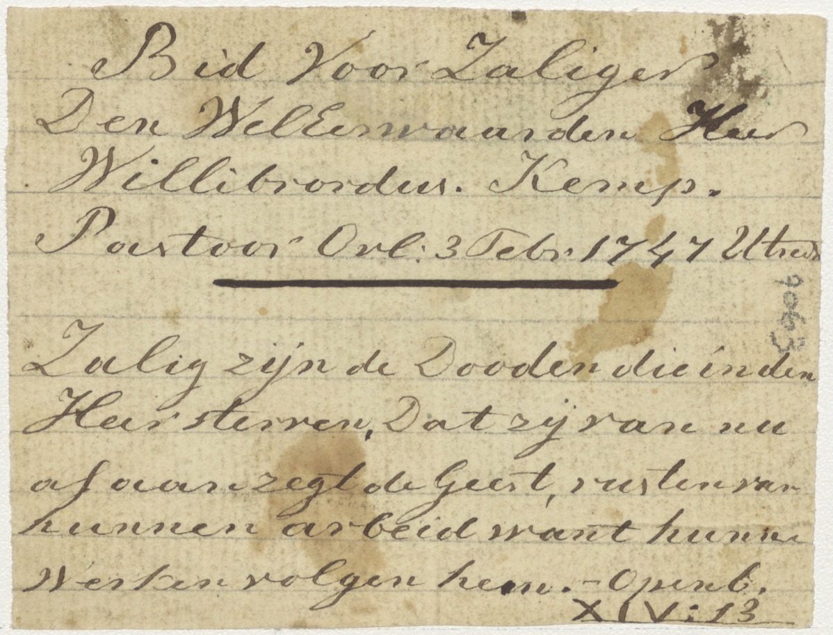 Jozef en Maria kloppen tevergeefs aan bij de herberg, kz. Bid voor ziel Willibrordus Kemp (+1747) pastoor Utrecht