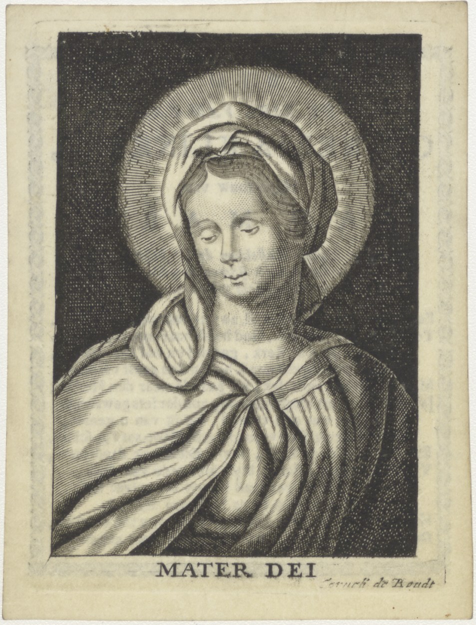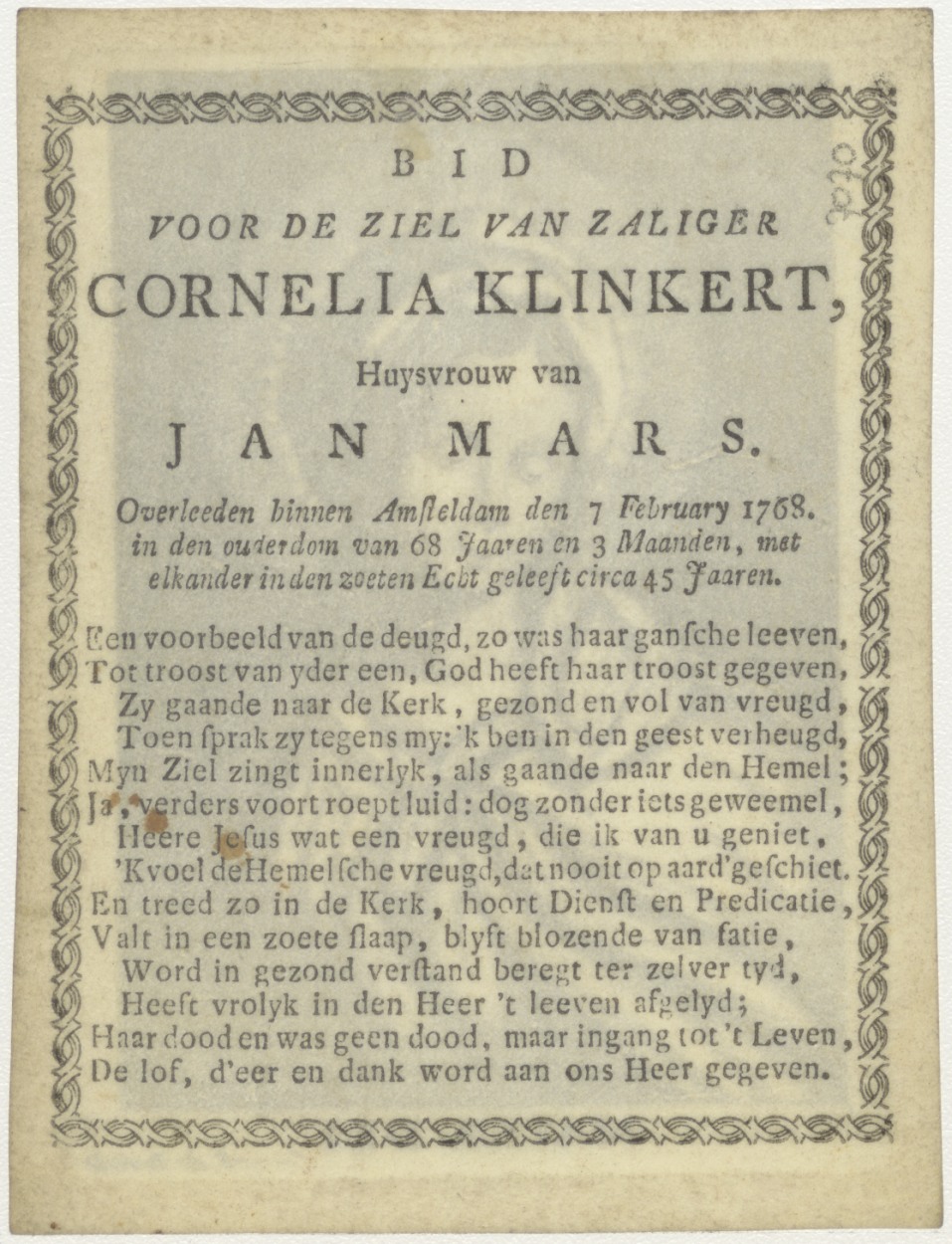 Maria, Mater Dei, kz. Bid voor ziel Cornelia Klinkert (+1768) Amsterdam, huisvrouw van Jan Mars, met gebed