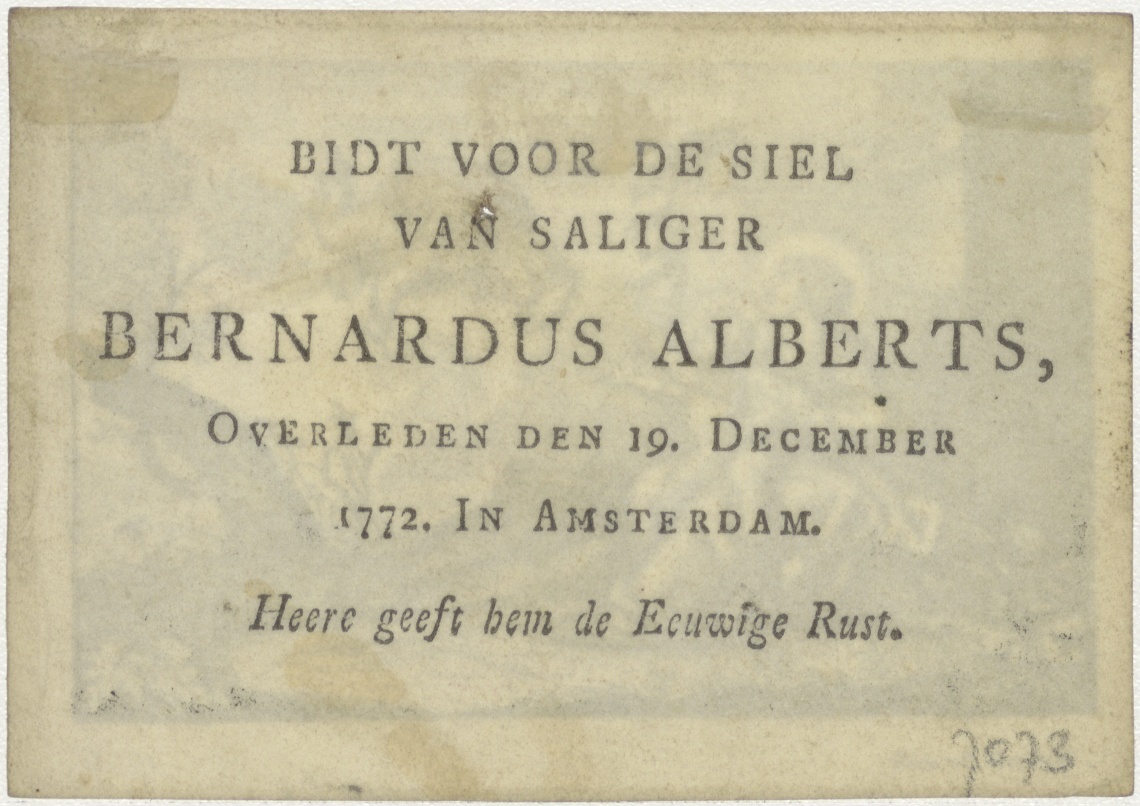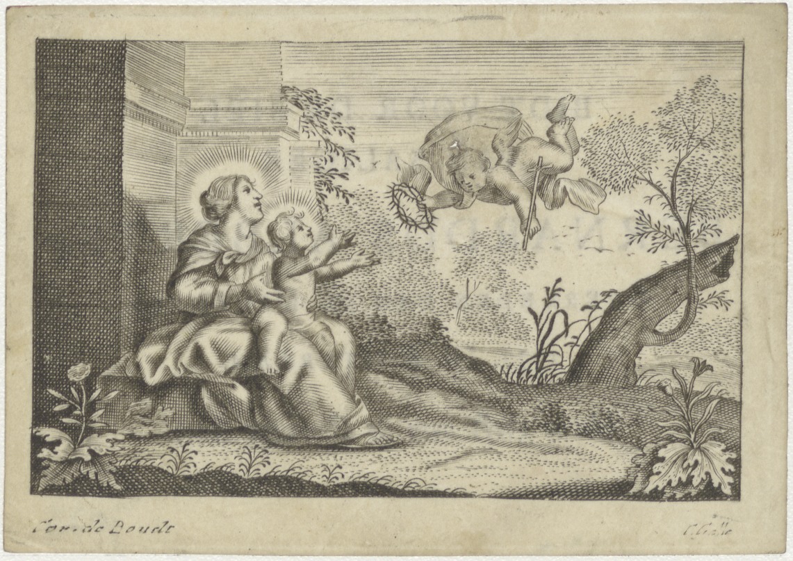 Maria met Christuskind in landschap met engel en doornenkroon, kz. Bid voor ziel Bernardus Alberts (+1772) Amsterdam