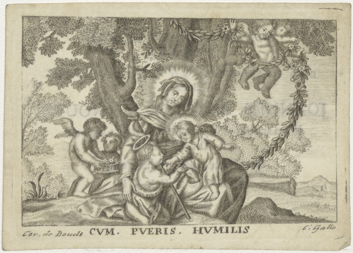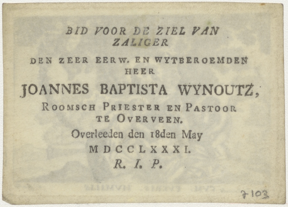 Maria met Christuskind en Johannes, kz. Religieus; bid voor ziel Joannes Wijnoutz, pastoor te Overveen