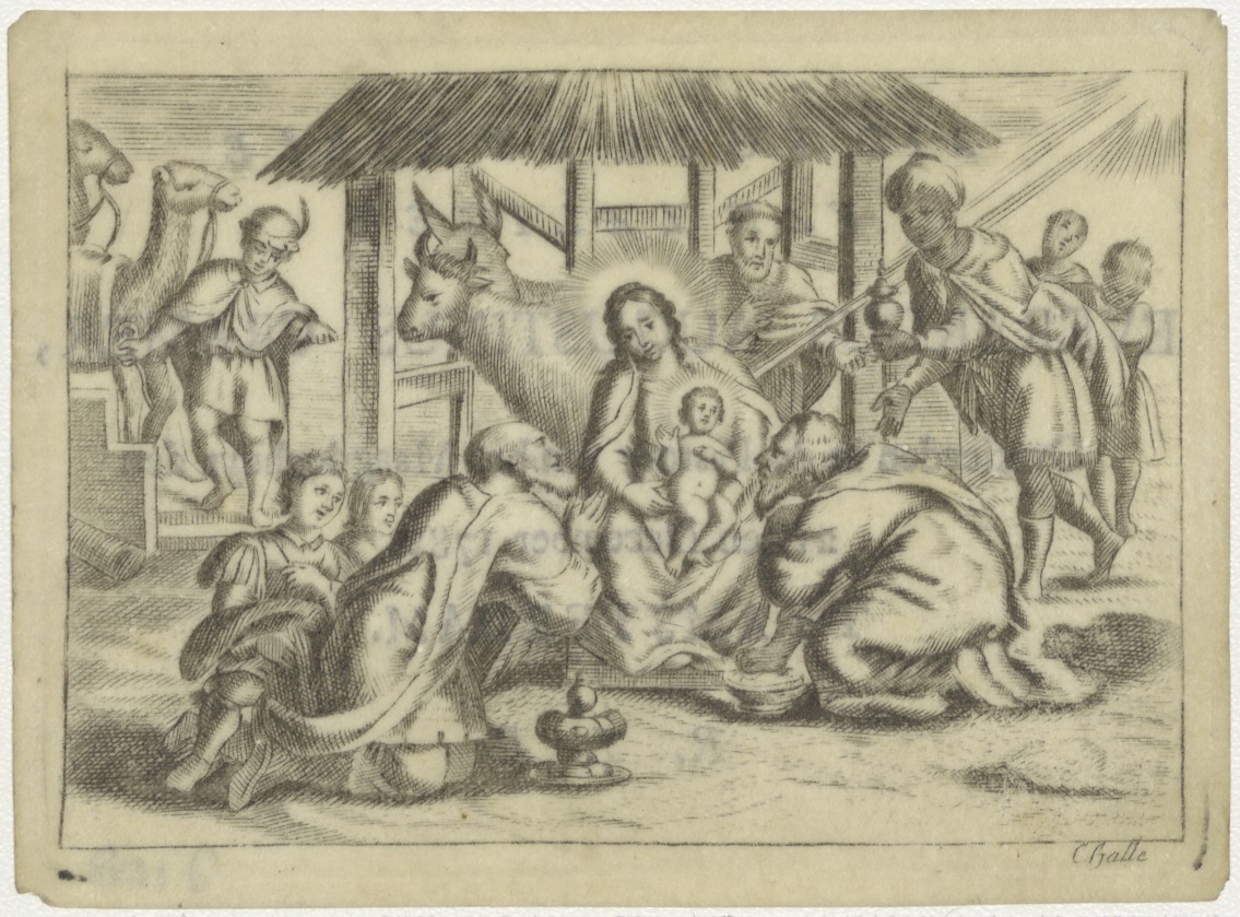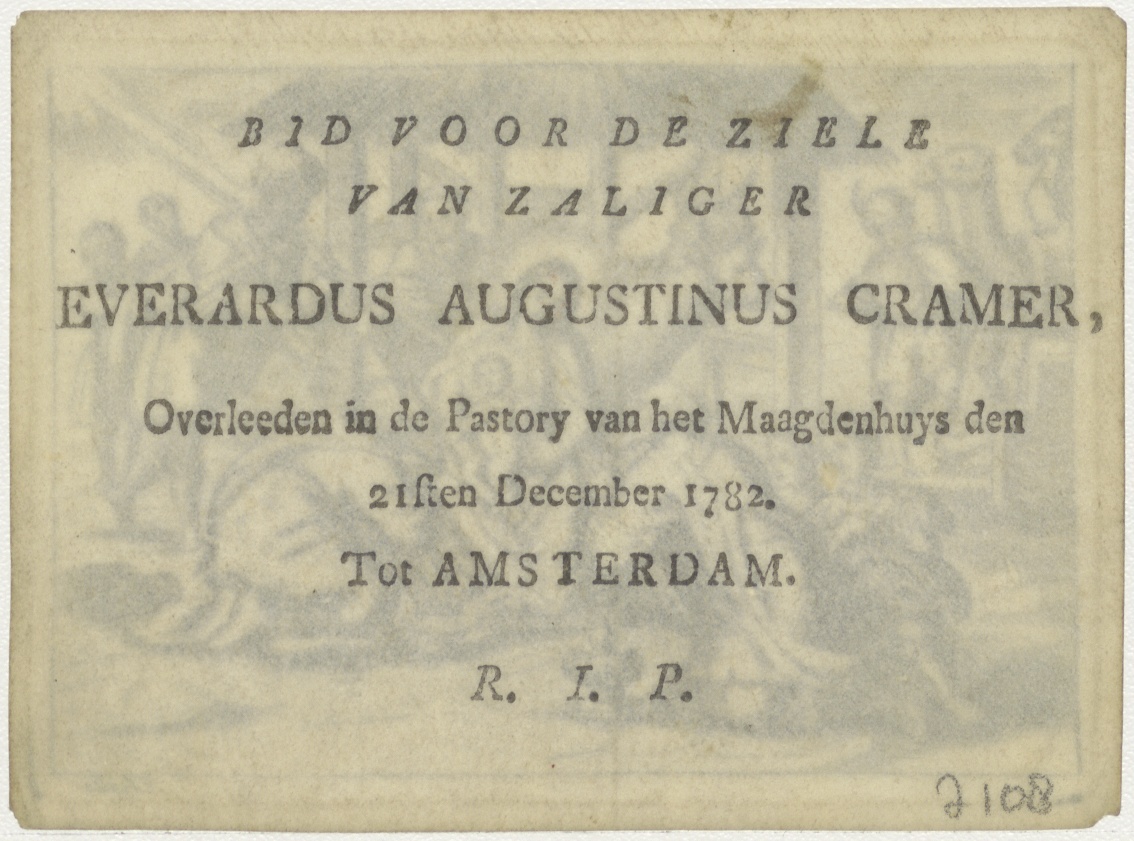 Aanbidding der koningen, kz. Bid voor ziel Everardus Cramer (+1782) overleden in pastory van het maagdenhuis Amsterdam