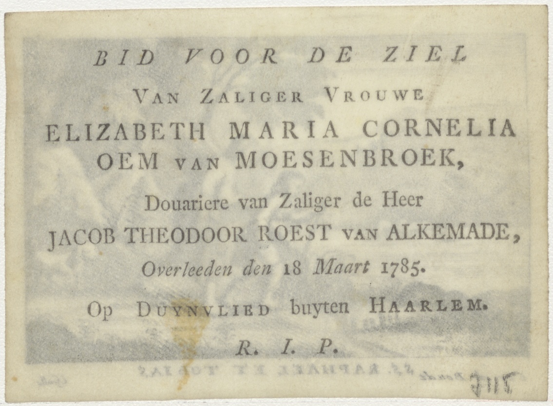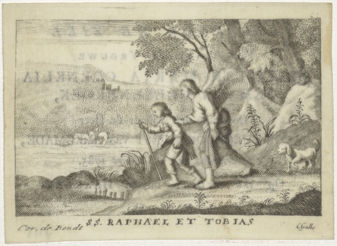 Tobias en de engel, kz. Bid voor ziel Oem van Moesenbroek-Roest van Alkmade (+1785) Duynvlied buiten Haarlem