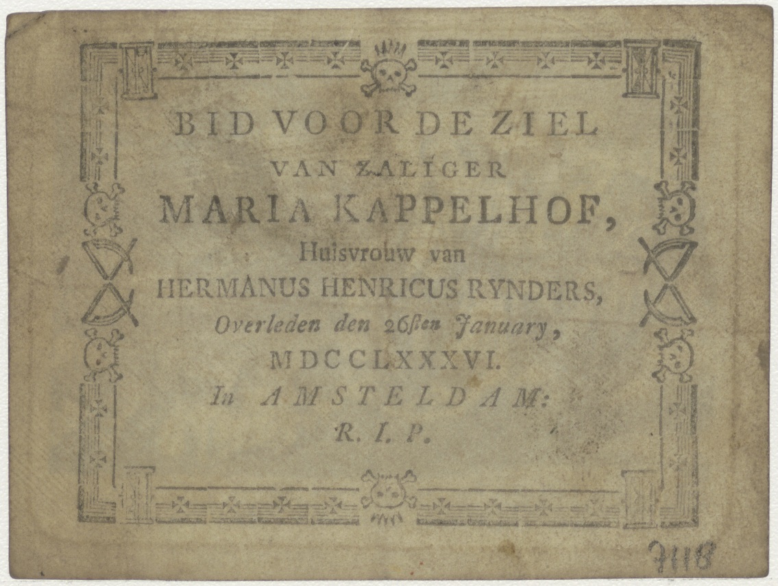 Onze Vader die in de hemel zijt; H. Drie-eenheid, kz. Bid voor ziel Kappelhof-Rynder (+1786) Amsterdam