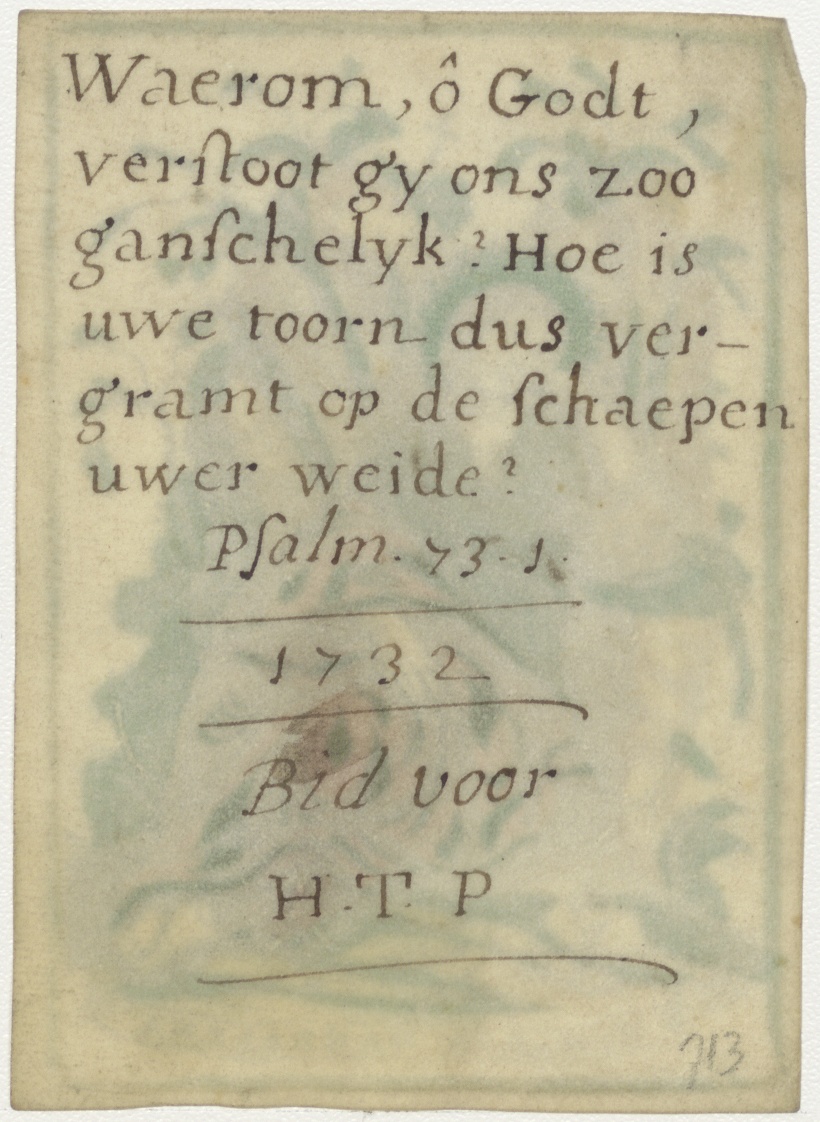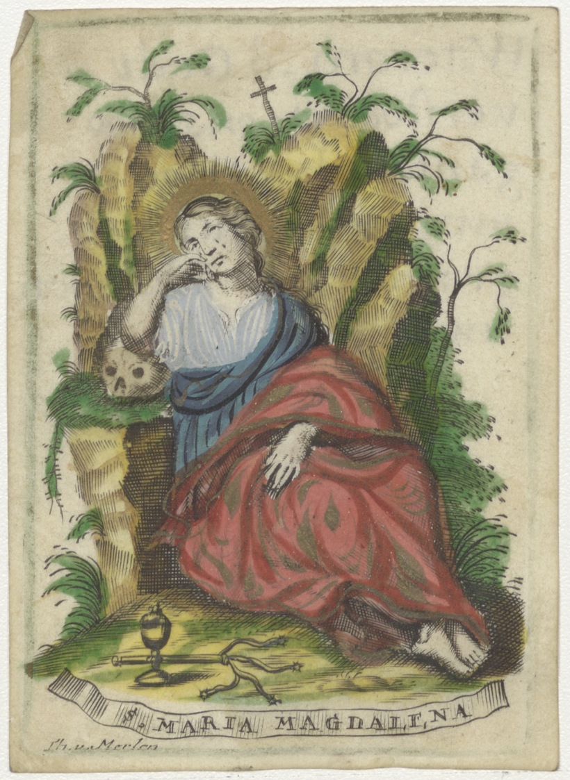 Maria Magdalena, ingekleurd, kz. bijbeltekst, 1732, bid voor H.T.P.