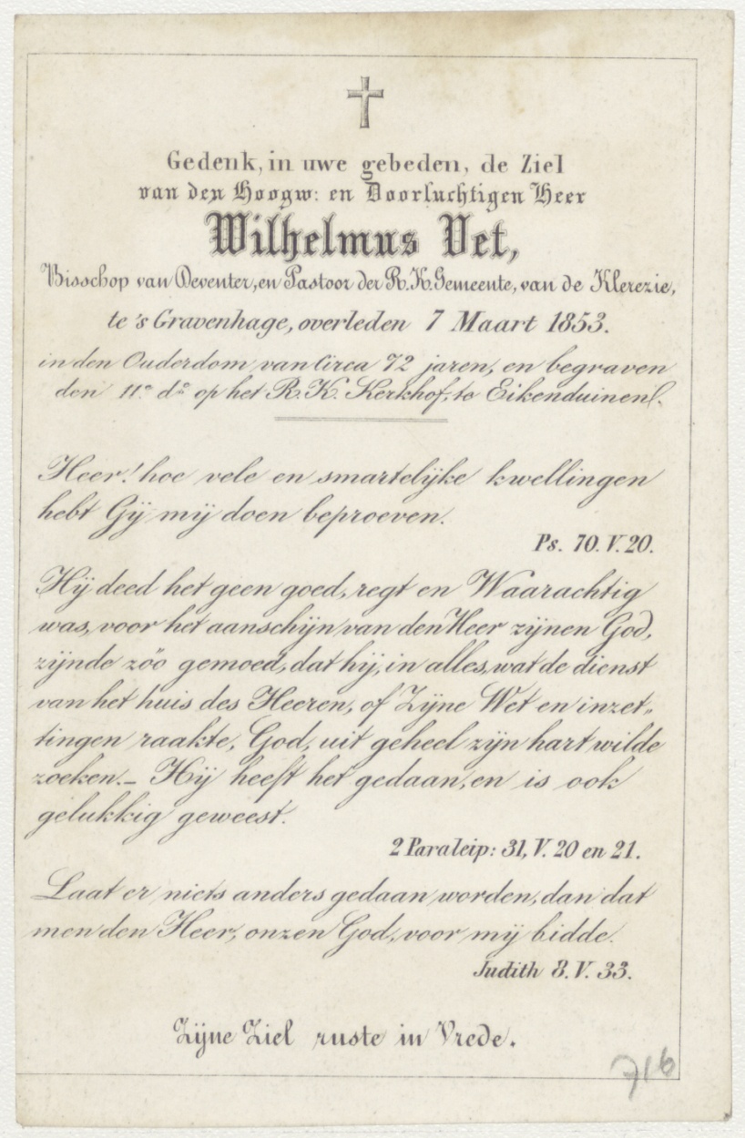 H. Madeleine (H. Magdalena), kz. Religieus;Bid voor ziel Wilhelmus Vet (+1853);bisschop deventer Klerezy;'s-Gravenhage;