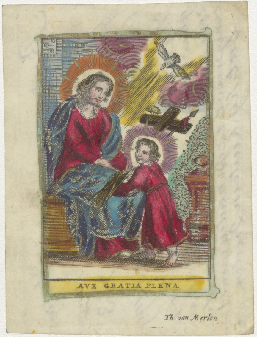 Christuskind geeft martelwerktuigen aan Maria, ingekleurd, kz. Bid voor ziel Gortmans (1799)
