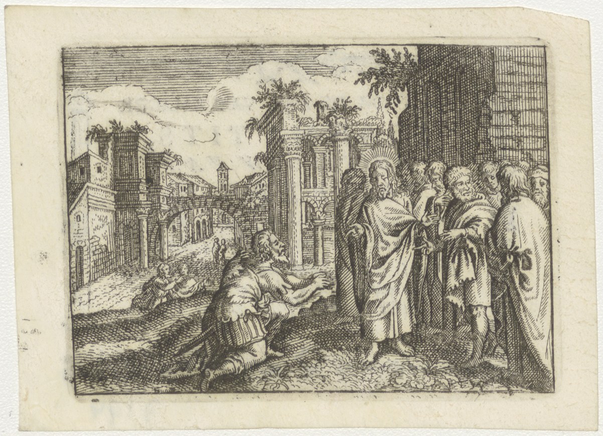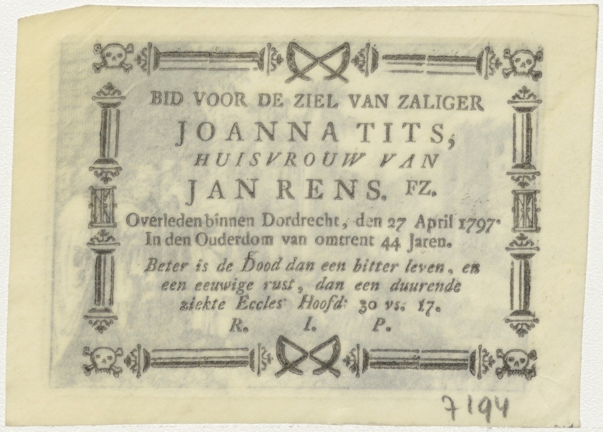 Christus met groep mensen, allen wijzen naar een man, kz. Bid voor ziel Tits-Rens (+1797) Dordrecht