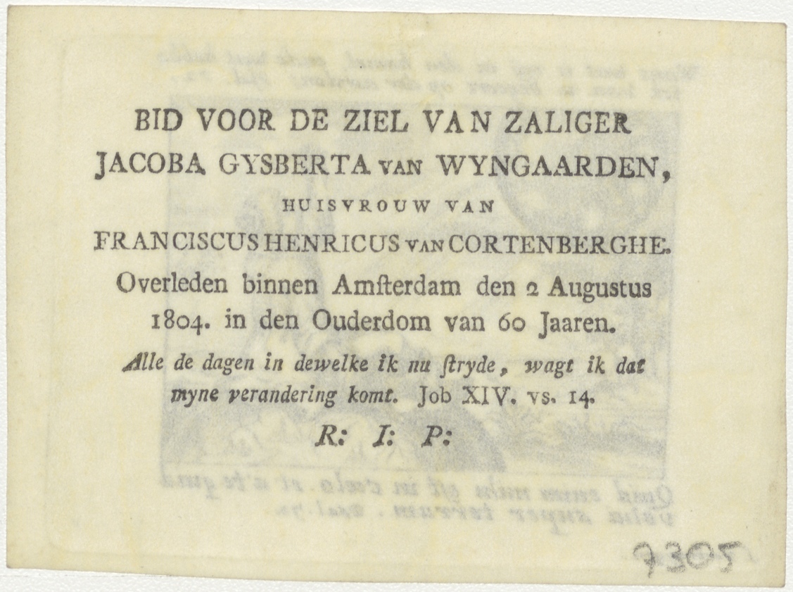 Want wat is mij in den hemel (Ps. 72), allegorie, kz. Bid voor ziel Wijngaarden-Cortenberghe (+1804) Amsterdam
