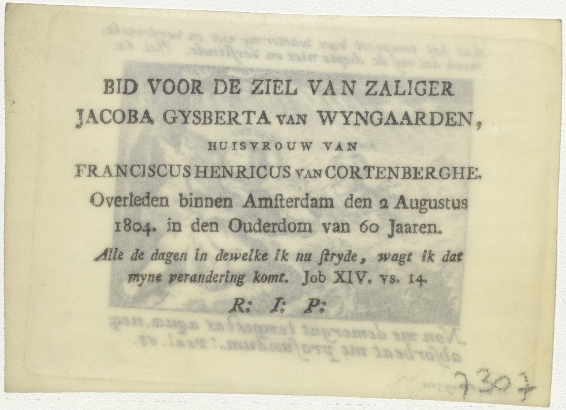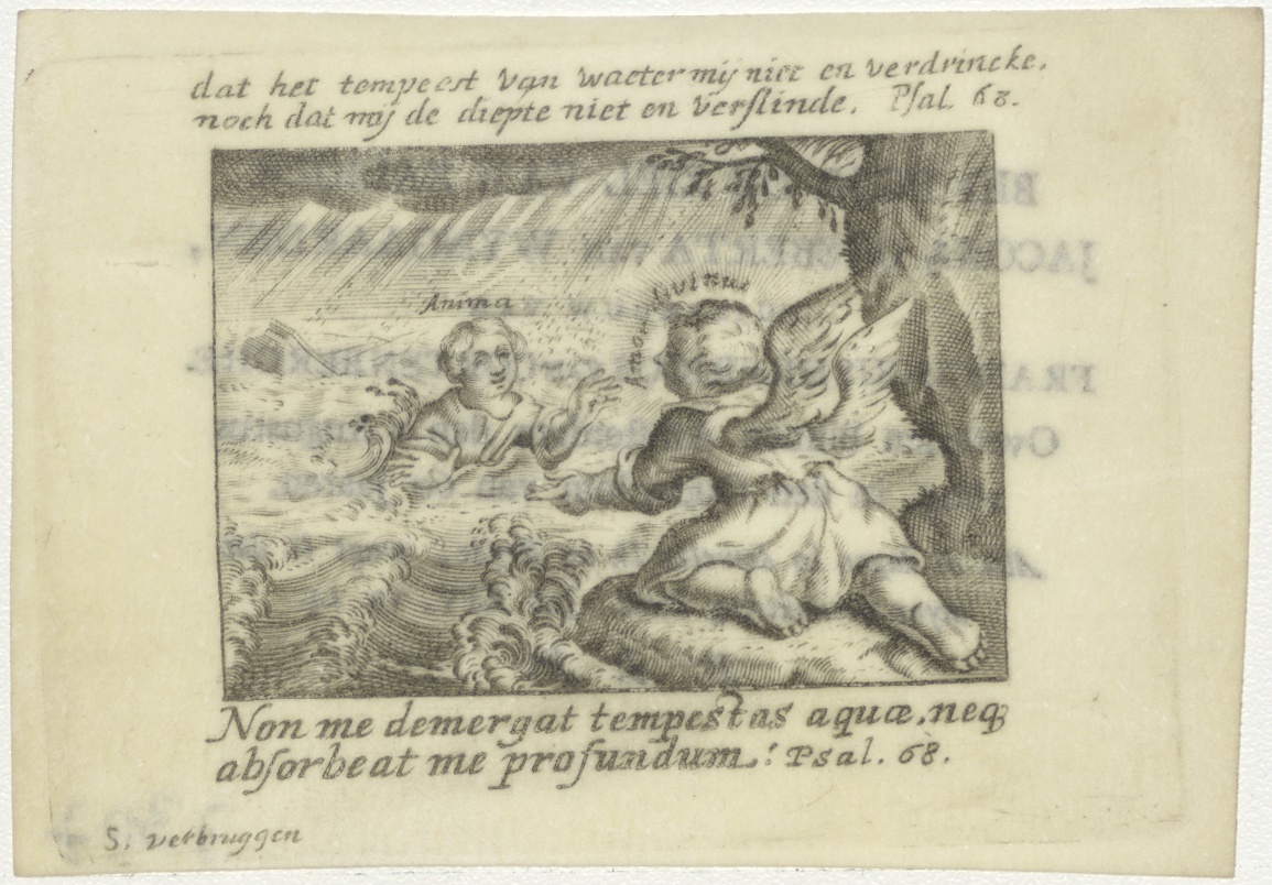 Amor divinus redt Anima uit woelige zee, met "dat het tempeest van waeter mij niet en verdrincke ..." (Psal.68), kz. Bid voor ziel Wijngaarden-Cortenberghe (+1804) Amsterdam