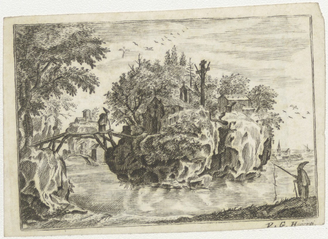 Twee kluizenaars met kluizenaarseiland, kz. Bid voor ziel Van Baalen (+1812) Amsterdam