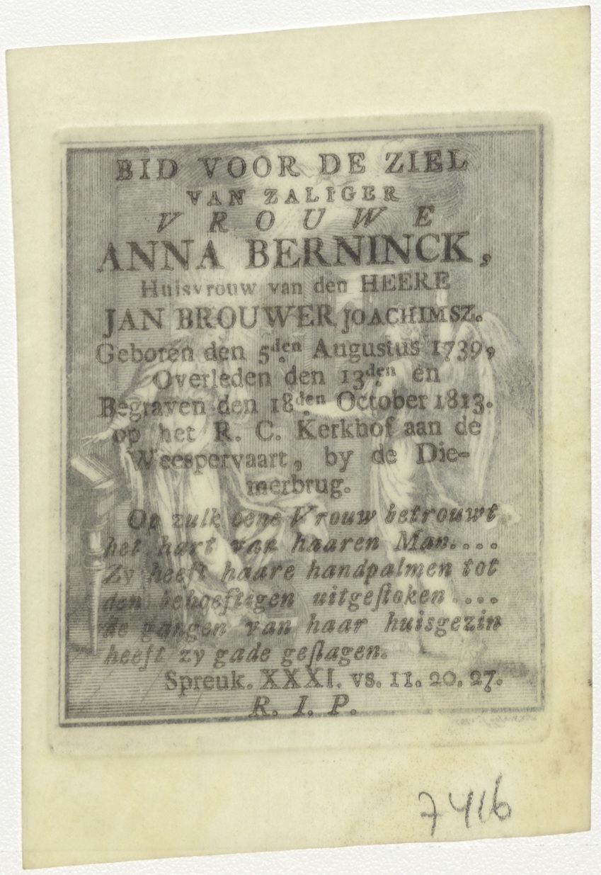 Anunciatie, kz. Bid voor ziel Berninck-Brouwer (+1813) Weespervaart bij Diemerbrug