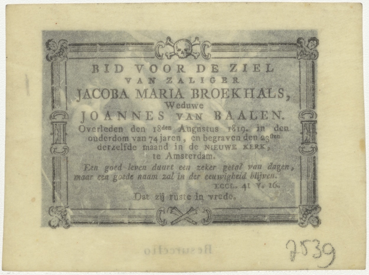 Verrijzenis van Christus, kz. Bid voor ziel Jacoba Maria Broekhals (+1819) Amsterdam, weduwe van Joannes van Baalen