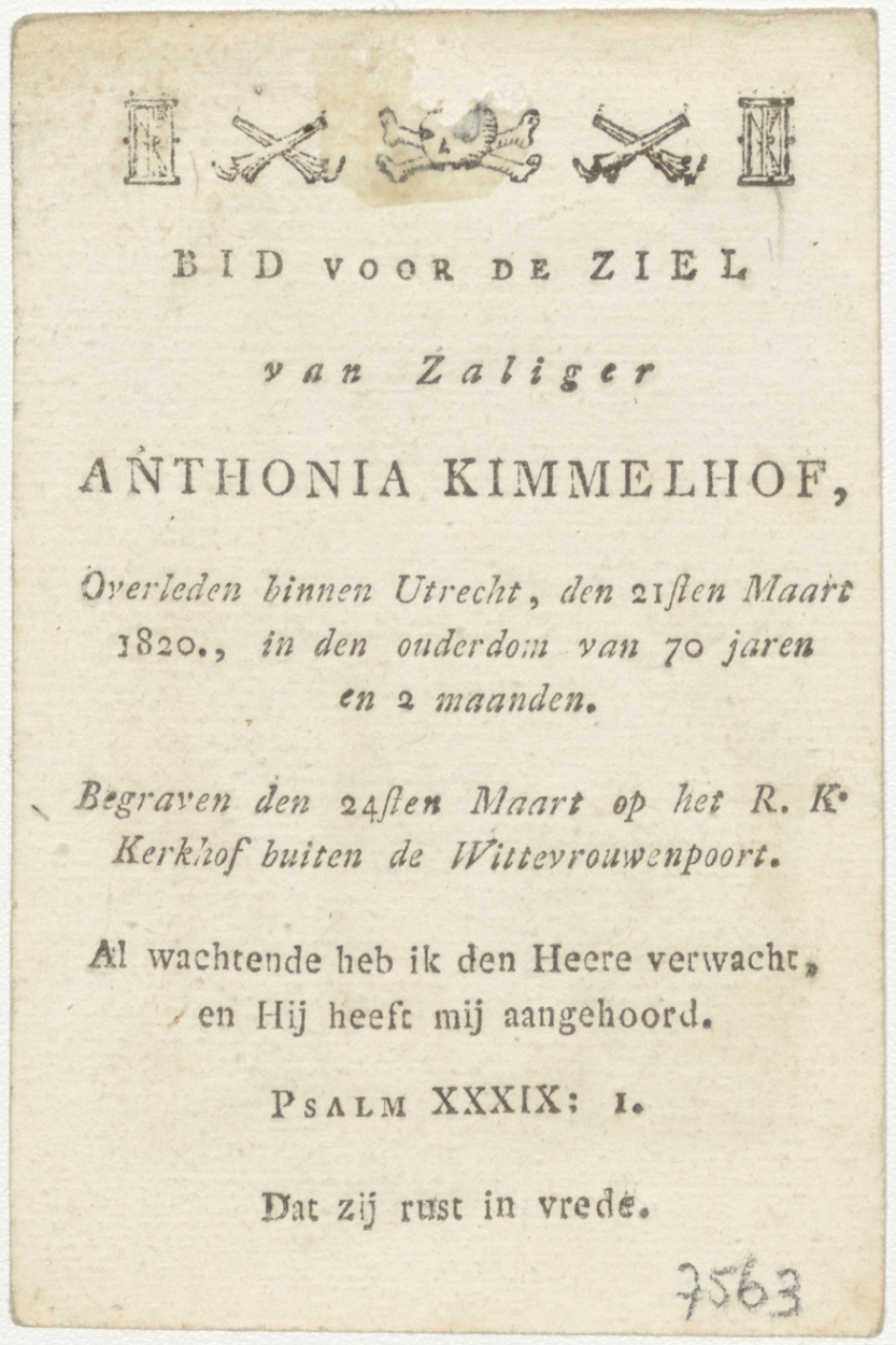 Presentatie van de maagd Maria als kind in de tempel (Frans), kz. Bid voor ziel Kimmelhof (+1820) Utrecht