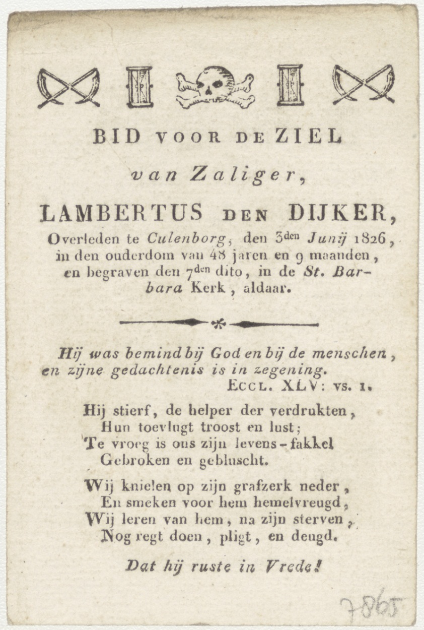 H. Fiacre, kz. Bid voor ziel Lambertus den Dijker (+1826), Culemborg