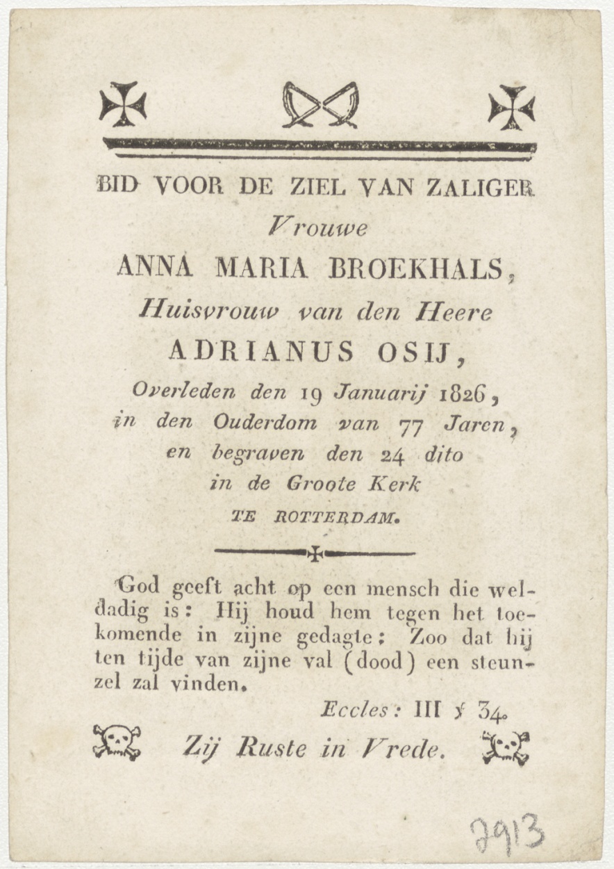 Gekruisigde Christus wordt met lans in de zij gestoken, kz. Bid voor ziel Anna Maria Broekhals (+1826) Rotterdam, huisvrouw van Adrianus Osij