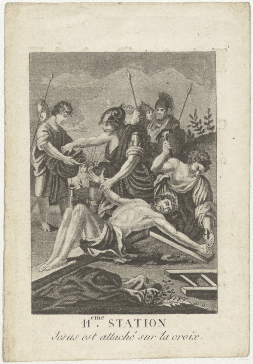 Passiescène (11e statie): Christus wordt aan het kruis genageld (Frans), kz. Religieus; bid voor ziel Patijn (+1828) Utrecht, bejaarde dochter