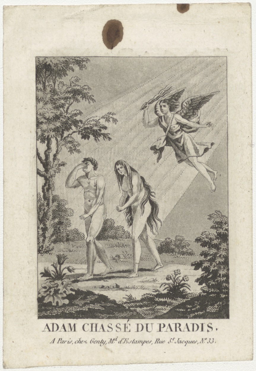 Adam en Eva worden uit het paradijs verjaagd (Frans), kz. Religieus; bid voor ziel Patijn (+1828) Utrecht, bejaarde dochter