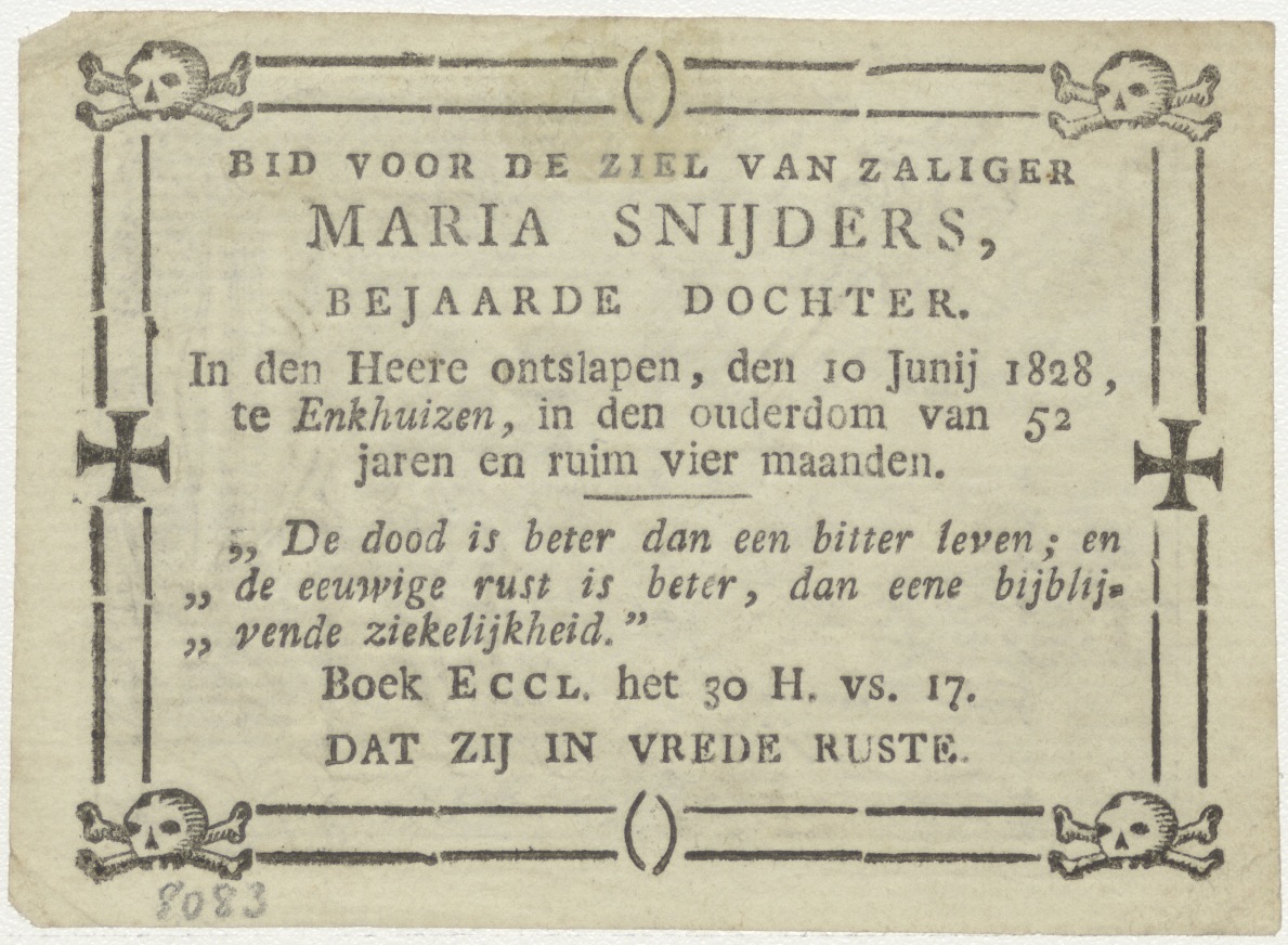 Maria met Christuskind; engel met kruis in de hemel, kz. Religieus; bid voor ziel Maria Snijders (+1828) bejaarde dochter