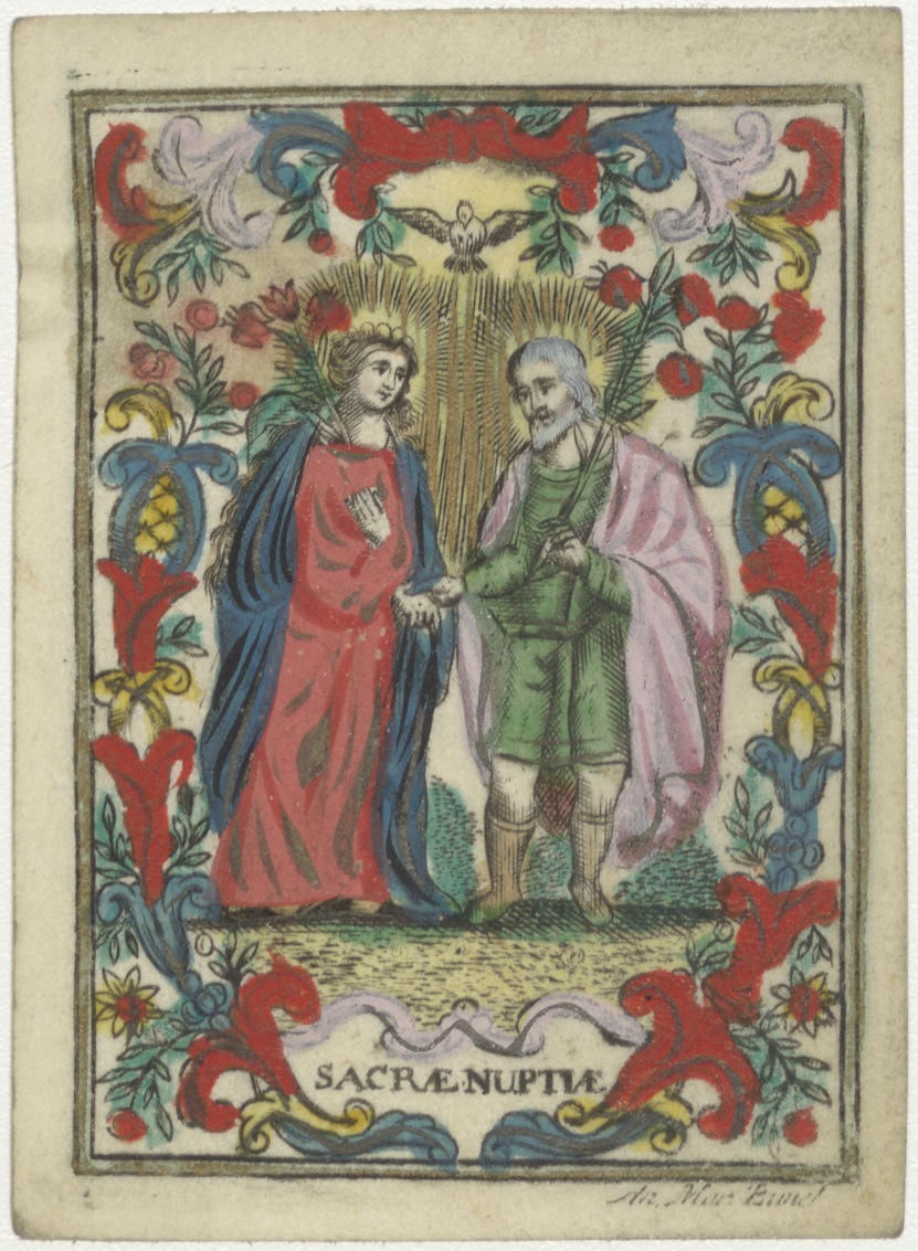 Maria en Jozef en duif, sacrae nuptiae, ingekleurd, kz. Van den Bergh als misdienaar;