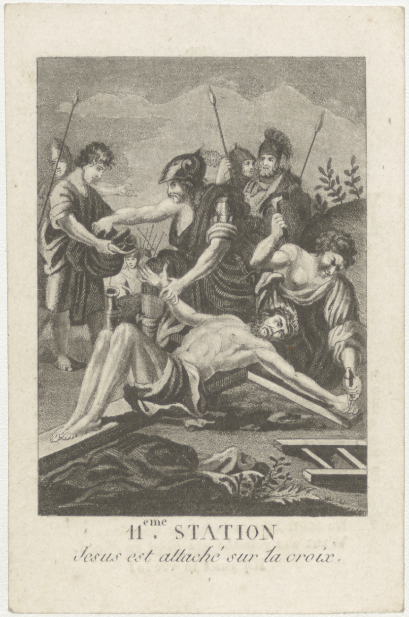 Passiescène (11e statie) Christus aan het kruis genageld (Frans), kz. Religieus bid voor ziel Wilhelmus de Wit (+1828) kanunnik Utrecht, president seminarie Amersfoort