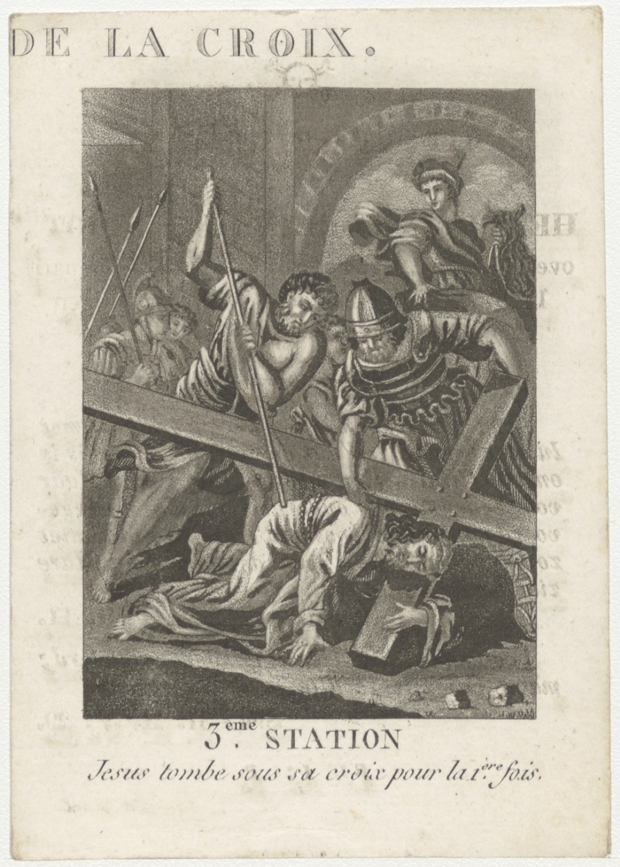 Passiescène (3e statie); Christus valt met het kruis voor de eerste maal (Frans), kz. Bid voor ziel De Groot (+1829) Amersfoort