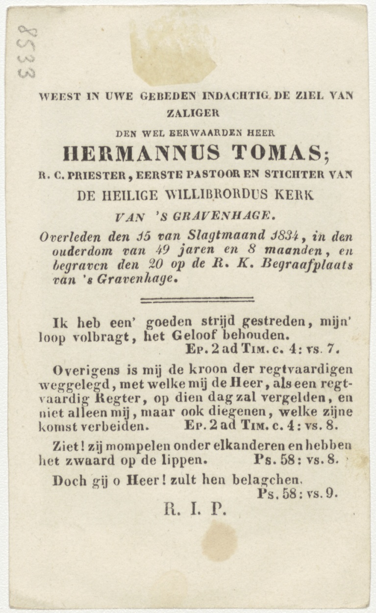 Priesterschap, kz. Religieus; bid voor ziel Hermannus Tomas (+1834) 's-Gravenhage
