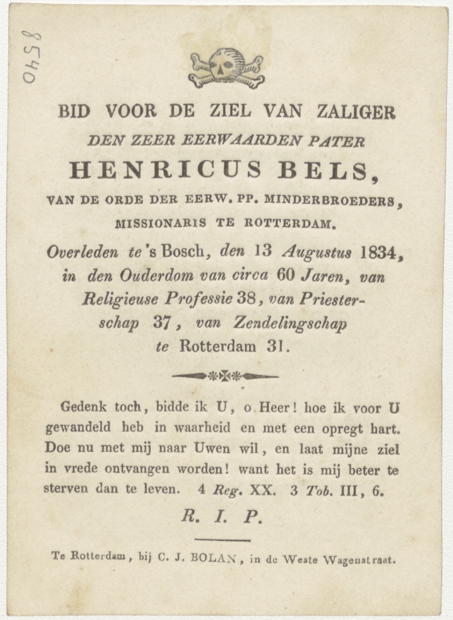 H. Gregoire (Frans), kz. Religieus; bid voor ziel Henricus Bels (+1834) minderbroeder Rotterdam