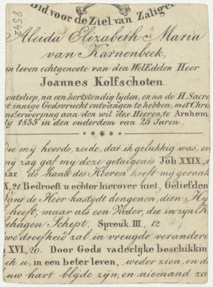 H. Stanislas Kostka, kz. Bid voor ziel Karnebeek-Kolfschoten (+1835) Arnhem