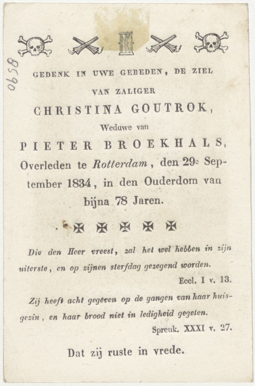 H. Suzanna (Frans), kz. Bid voor ziel Christina Goutrok (+1834) Rotterdam, weduwe van Pieter Broekhals