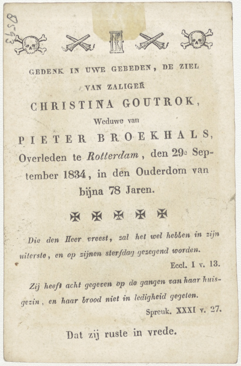 H. Gabriel, aartsengel (Frans), kz. Bid voor ziel Christina Goutrok (+1834) Rotterdam, weduwe van Pieter Broekhals