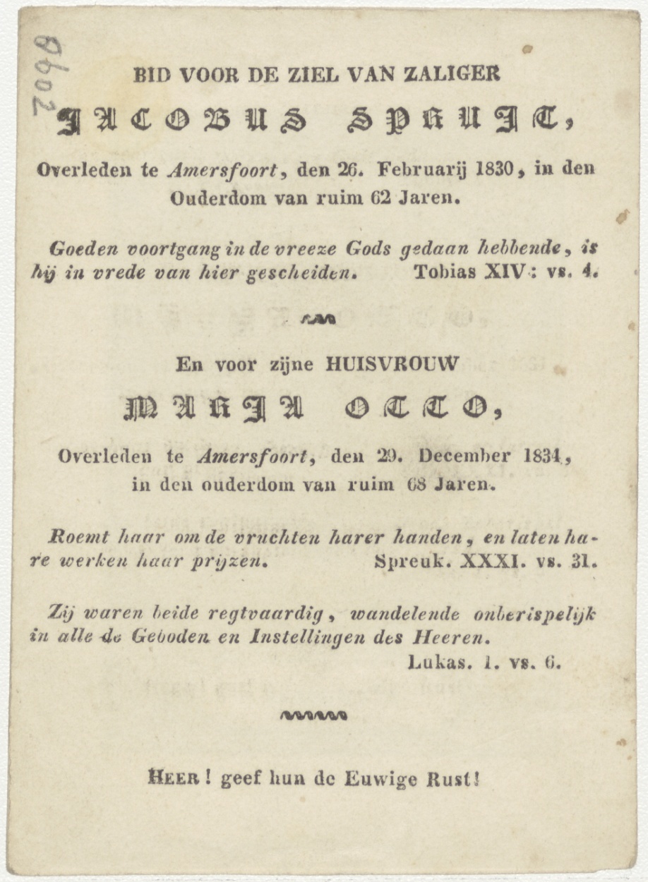 H. Thomas, kz. Bid voor ziel Jacobus Spruit (+1830) en zijn huisvrouw Maria Otto (+1834), Amersfoort