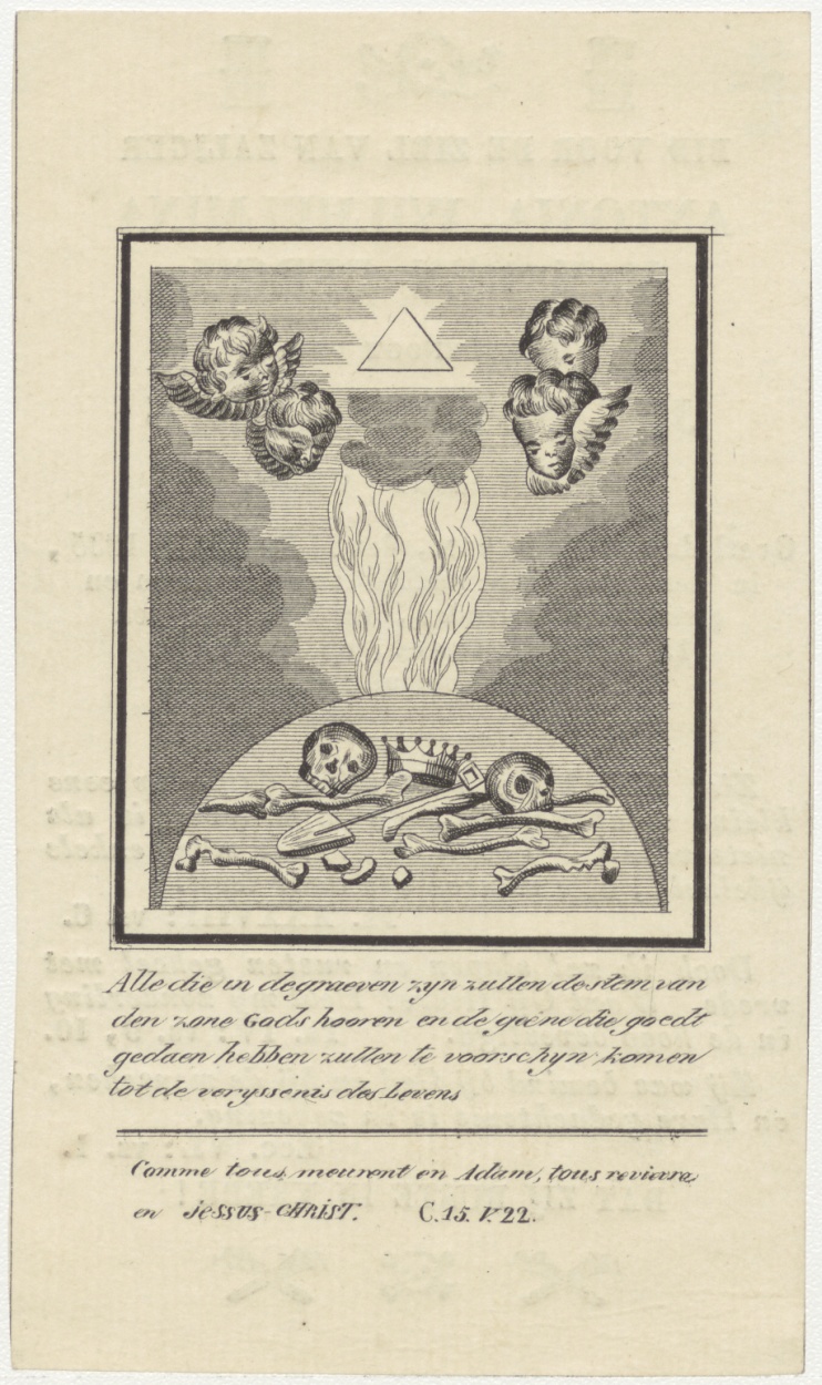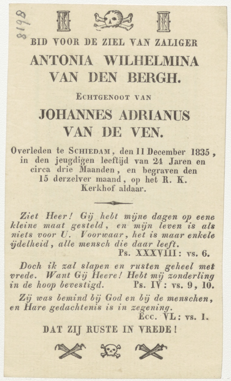 Kroon, schedels en botten op vurige heuvel, met "Alle die in de graeven zijn zullen de stem van den zone Gods hooren ...", kz. Bid voor ziel Antonia Wilhelmina van de Ven-van den Bergh (+1835) Schiedam