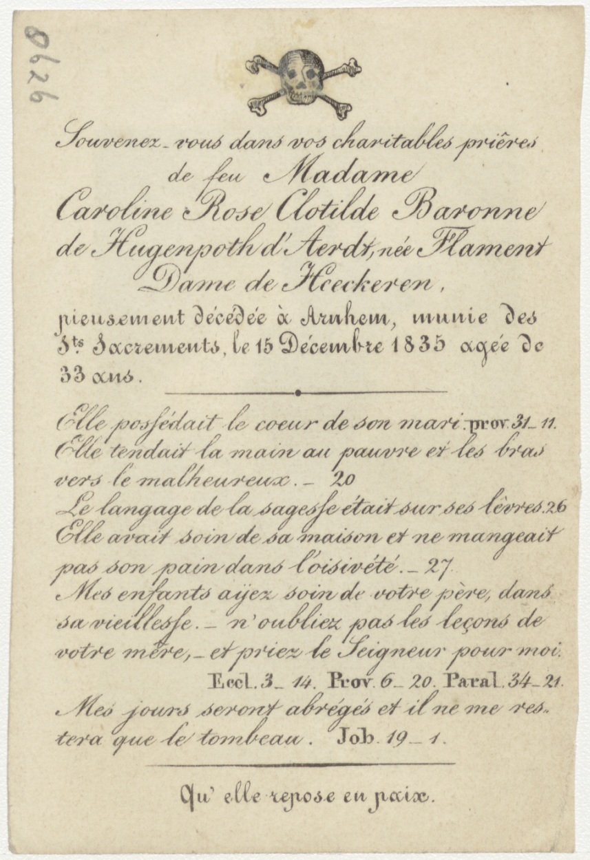 H. Hart van Maria (Frans), kz. Bid voor ziel baron de Hugenpoth-Flement (+1835) Arnhem (Frans)