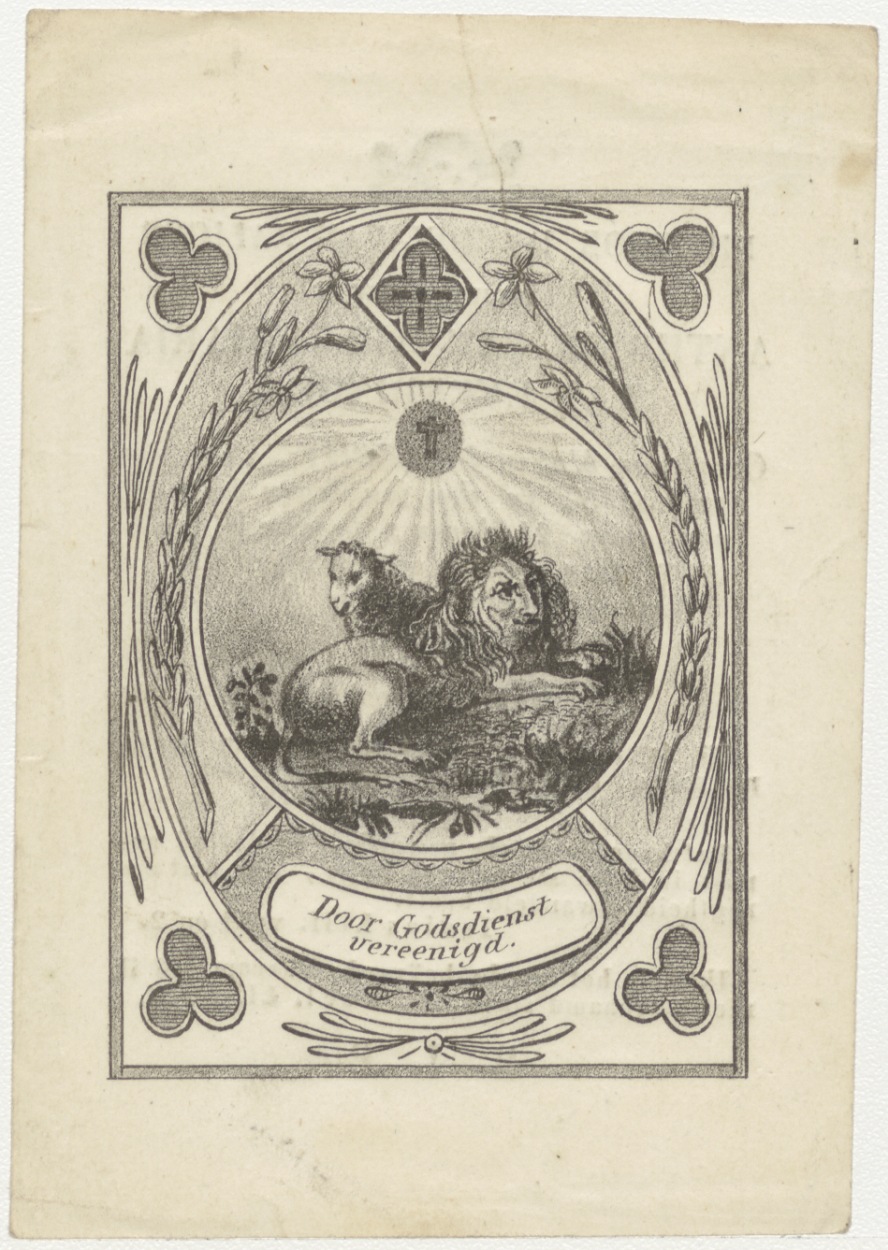 Leeuw en lam, door godsdienst vereenigd, kz. Bid voor ziel Van Everingen (+1835) Utrecht