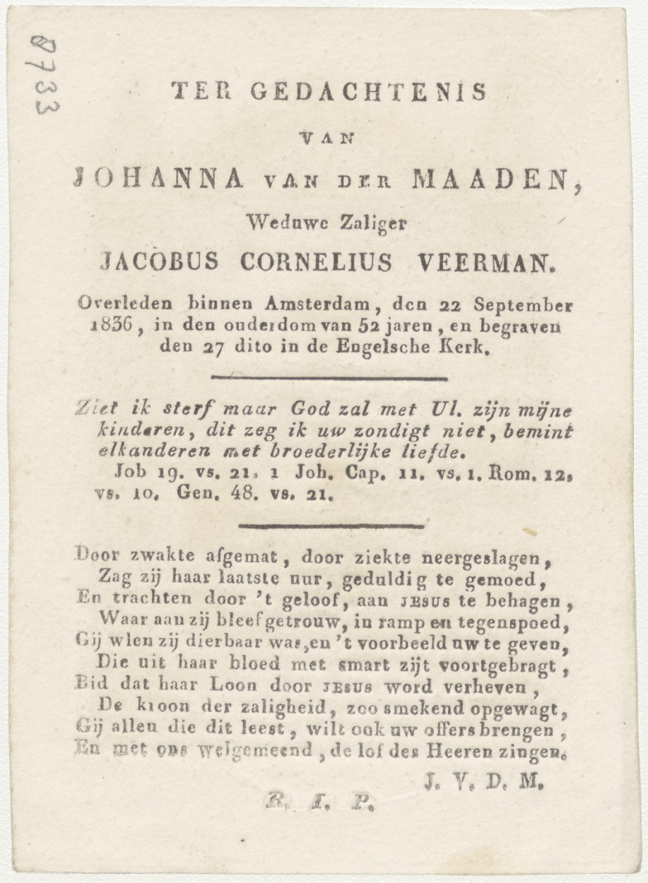 H. Euphrasie, kz. Bid voor ziel Johanna van der Maaden (+1836) Amsterdam, weduwe van Jacobus Cornelius Veerman
