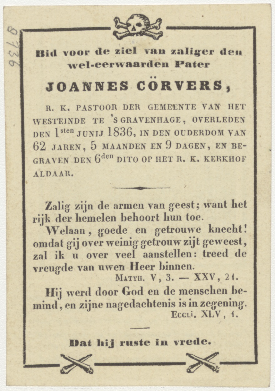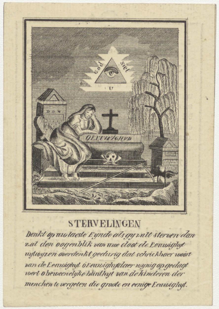 Vrouw bij sarcofaag, stervelingen, kz. Religieus; bid voor ziel Joannes Cörvers (+1836) pastoor gemeente van't Westeinde Den Haag
