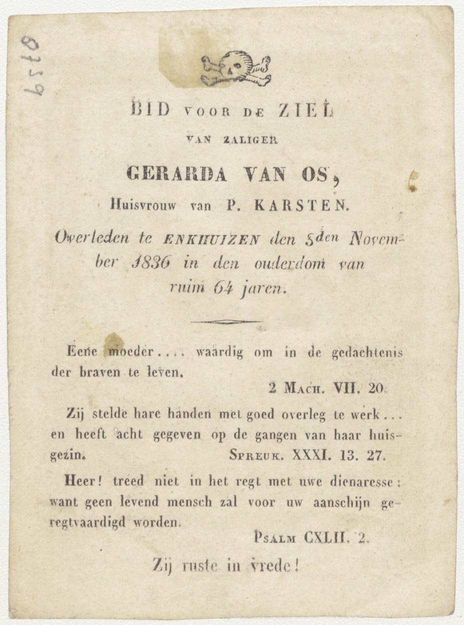 H. Bewaarengel (Frans), kz. Bid voor ziel Gerarda van Os (+1836) Enkhuizen, huisvrouw van P. Karsten