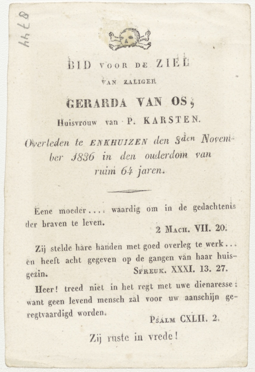 H. Cecile, kz. Bid voor ziel Gerarda van Os (+1836) Enkhuizen, huisvrouw van P. Karsten
