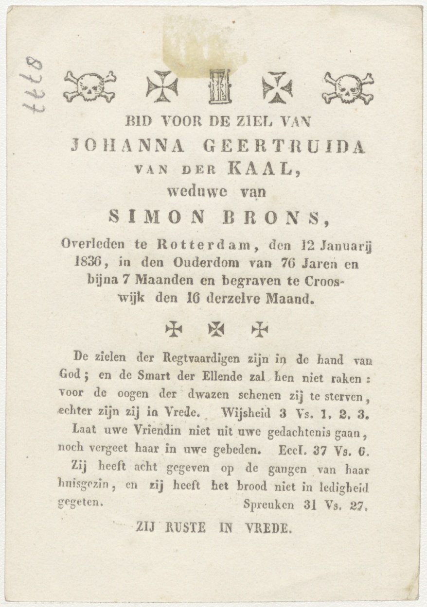 H. Maxime (Frans), kz. Bid voor ziel Van der Kaal-Brons (+1836) Rotterdam