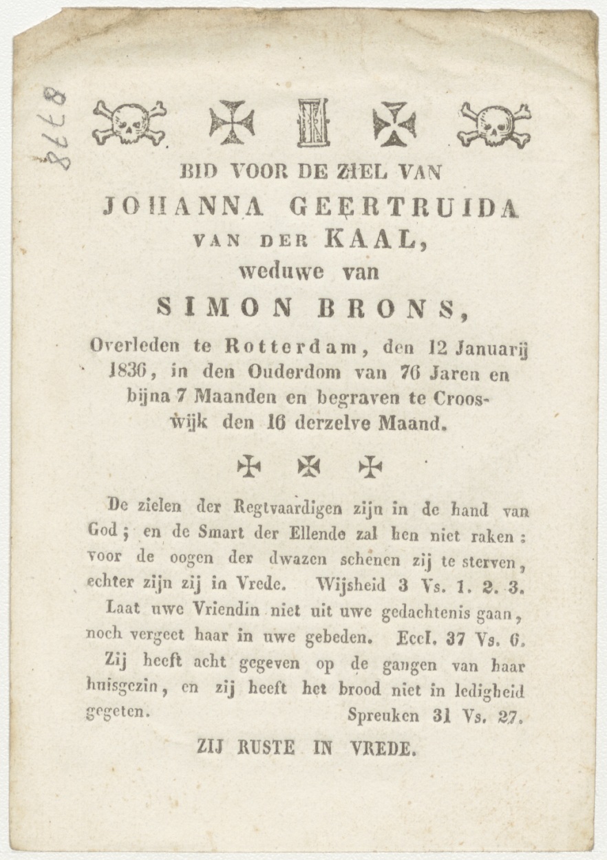 Boete verminderd de pijn (Frans), kz. Bid voor ziel Van der Kaal-Brons (+1836) Rotterdam