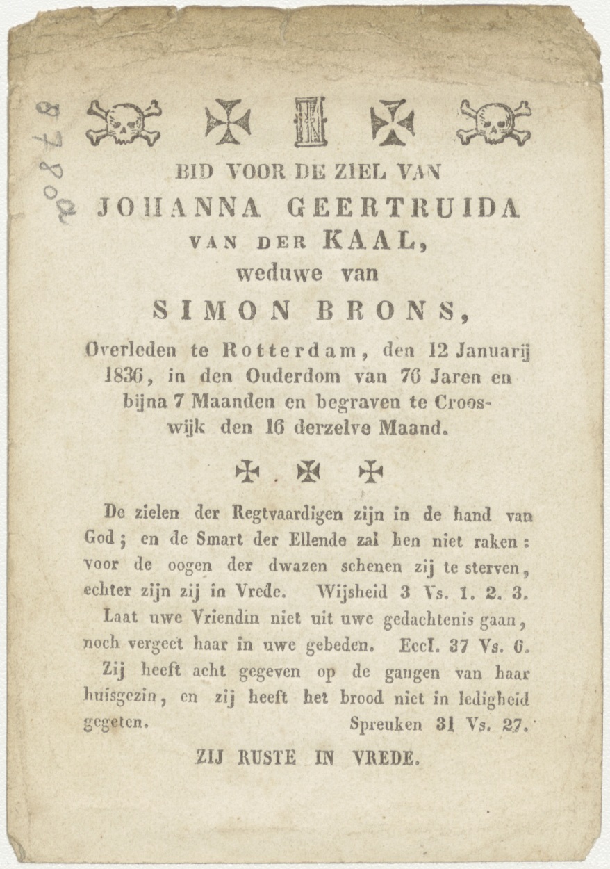 Alle gedachten zijn voor u (Frans), kz. Bid voor ziel Van der Kaal-Brons (+1836) Rotterdam