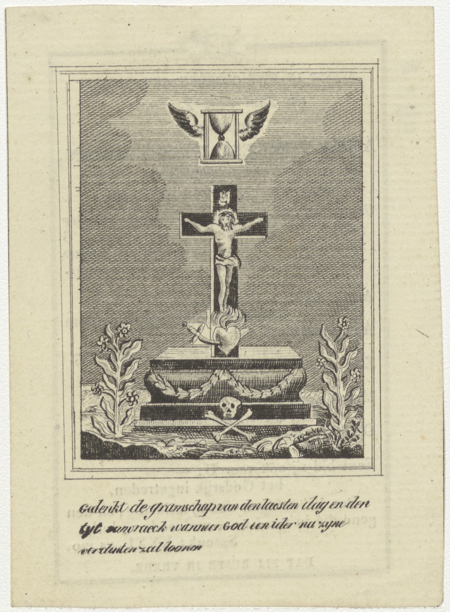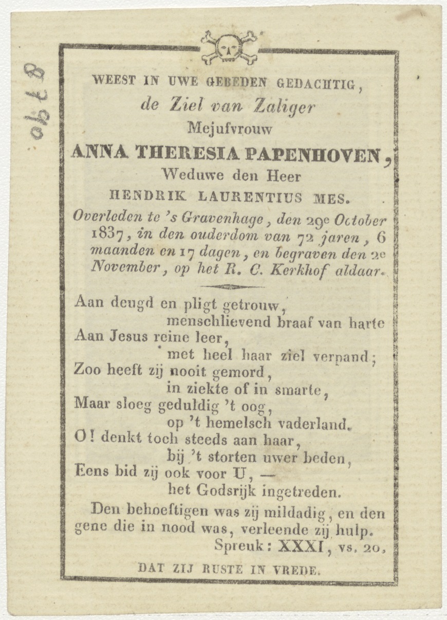 Gedenk de gramschap... kruis op sarcofaag, kz. Bid voor ziel Mes-Papenhoren (+1837) 's-Gravenhage