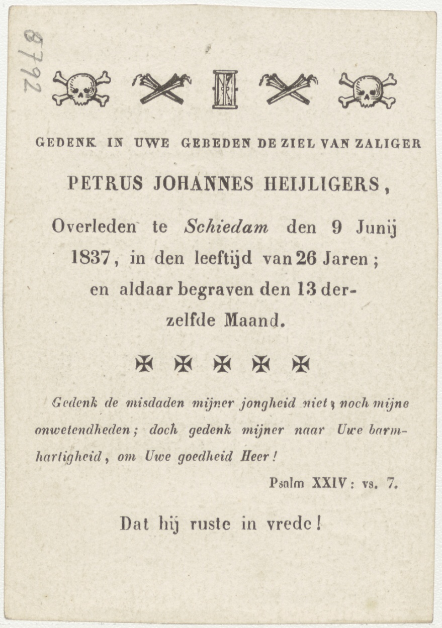 Christus gekruisigd, zaligmaker der wereld, kz. Bid voor ziel Heyligers (+1837) Schiedam