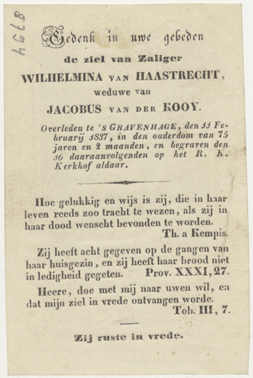Stervelingen, kruis op sarcofaag, kz. Bid voor ziel Van der Koog-Van Haastrecht (+1837) 's-Gravenhage