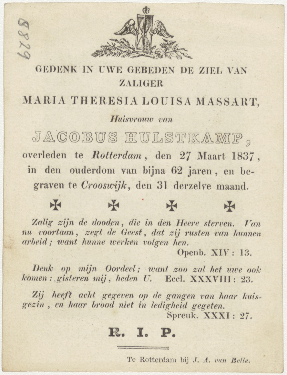Christuskind Jezus in zijne kindsheid, kz. Bid voor ziel Hulstkamp-Massart (+1837) Rotterdam