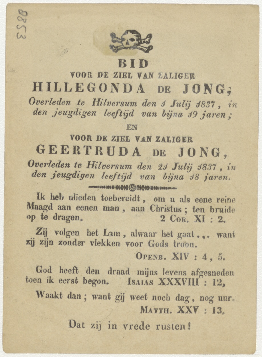 H. Bonifatius, kz. Bid voor ziel De Jong (+1837) dubbelgebruik, twee zusters overleden 1-21 juli