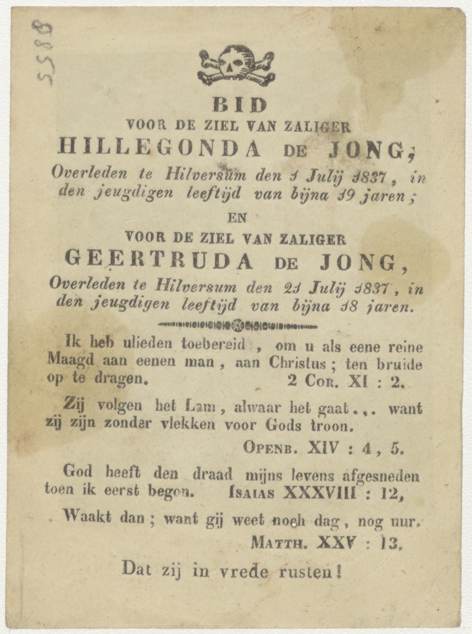 H. Phillippus, kz. Bid voor ziel De Jong (+1837) dubbelgebruik, twee zusters overleden 1-21 juli