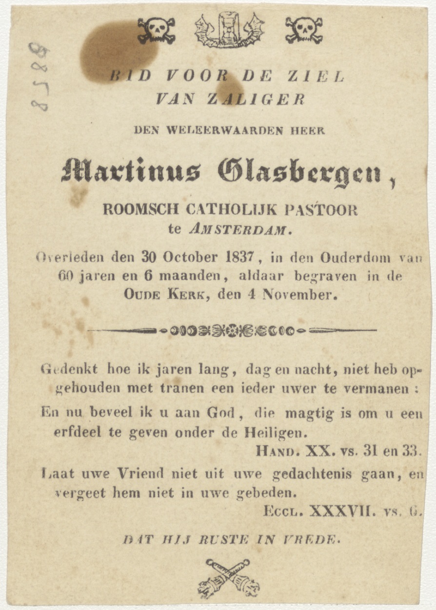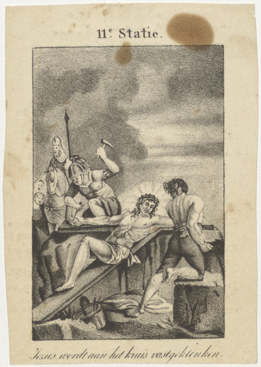 Passiescène (11e statie) Jezus wordt aan het kruis genageld, kz. Religieus; bid voor ziel Martinus Glasbergen (+1837) pastoor te Amsterdam
